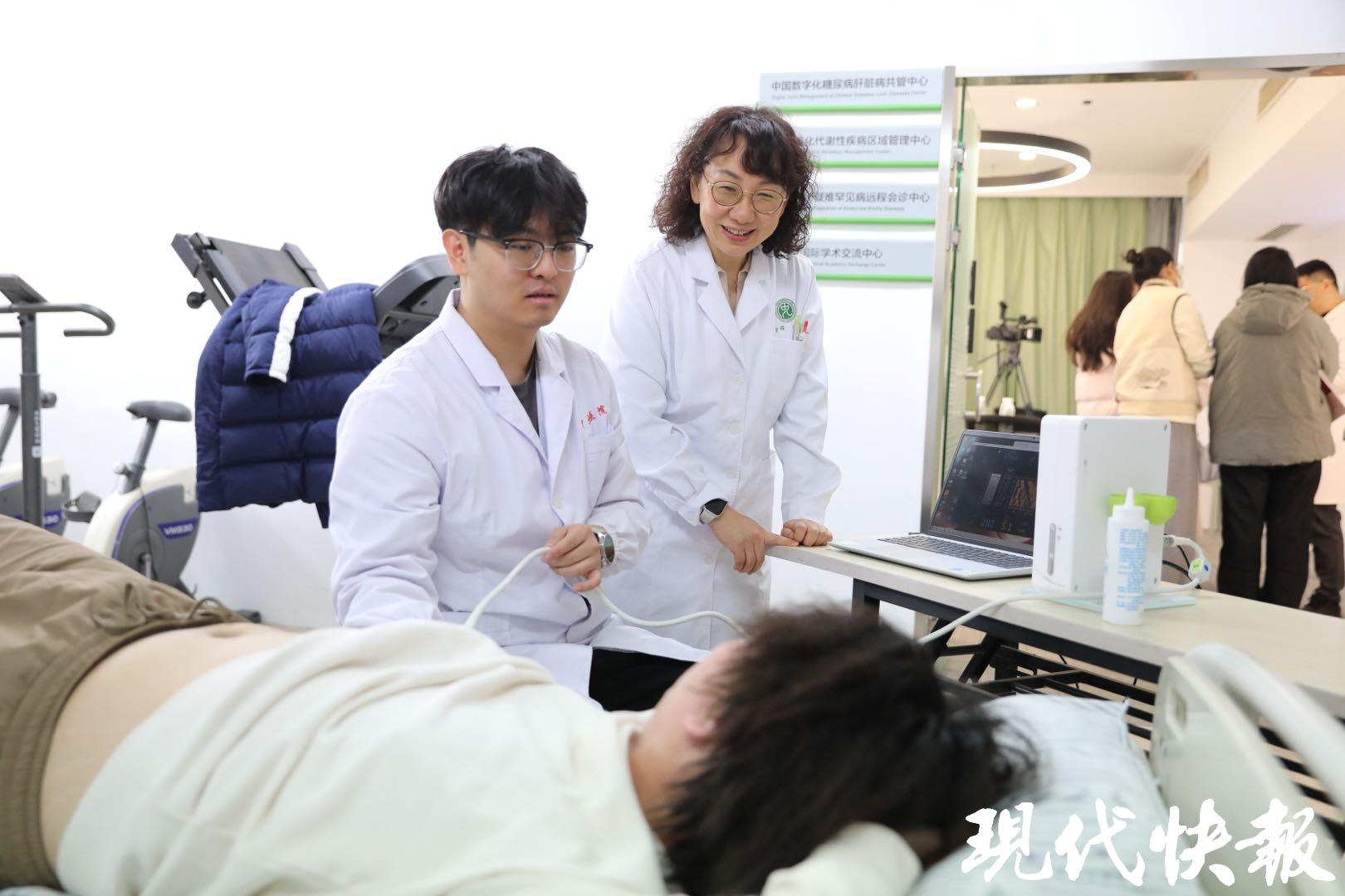 現(xiàn)場(chǎng),團(tuán)隊(duì)成員、東南大學(xué)醫(yī)學(xué)院博士研究生張胤秋演示了如何進(jìn)行“肝臟硬度”檢測(cè)。只見(jiàn)他手持無(wú)創(chuàng)肝臟彈性檢測(cè)設(shè)備探頭,將其輕置于受檢者的右上腹肋間區(qū)。隨著儀器啟動(dòng),屏幕上的數(shù)字開(kāi)始跳動(dòng)。“這項(xiàng)檢測(cè)就像給肝臟做一次B超”,他解釋道,設(shè)備操作簡(jiǎn)便,僅需5分鐘即可定量評(píng)估肝臟脂肪含量和肝纖維化程度。