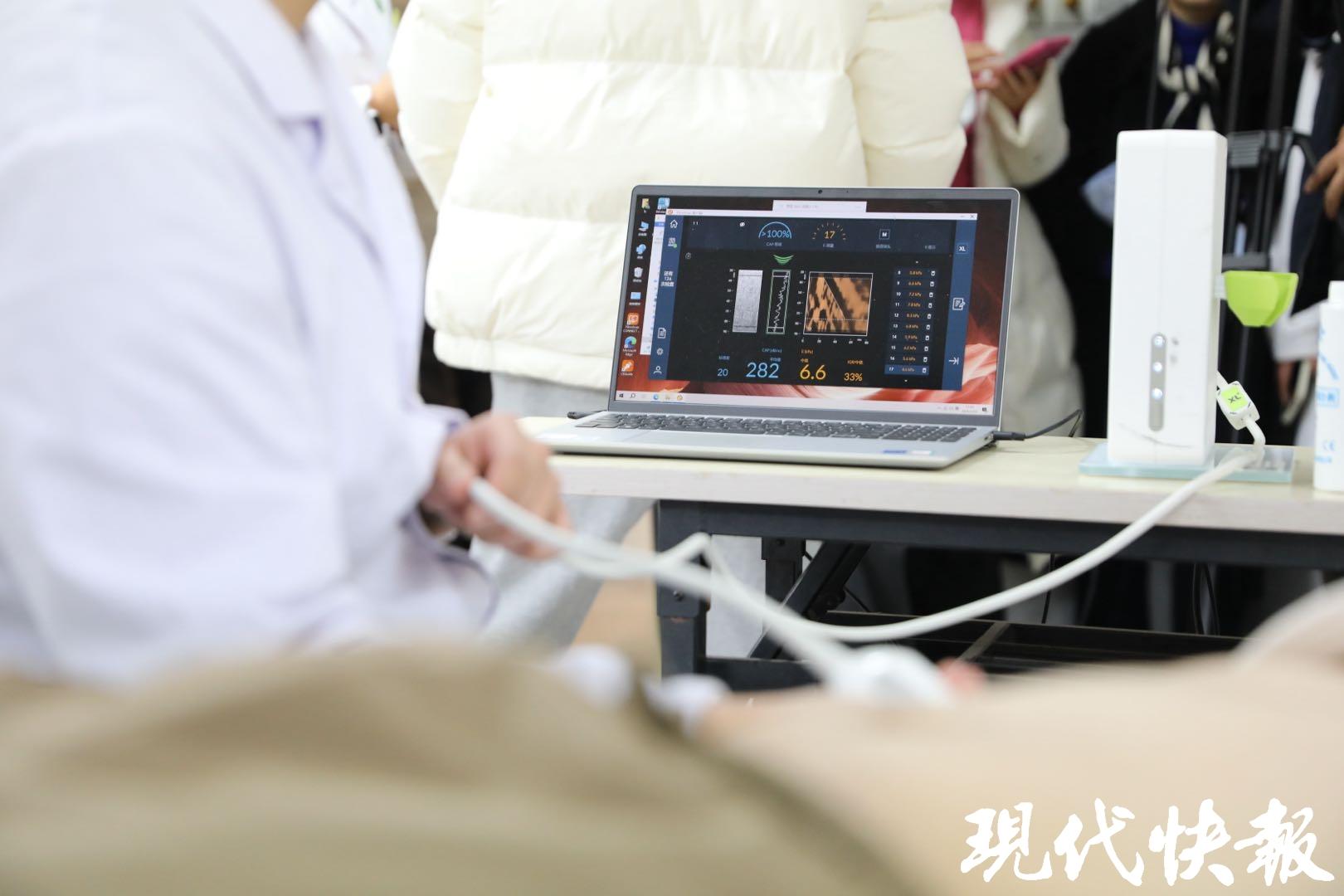 現(xiàn)場(chǎng),團(tuán)隊(duì)成員、東南大學(xué)醫(yī)學(xué)院博士研究生張胤秋演示了如何進(jìn)行“肝臟硬度”檢測(cè)。